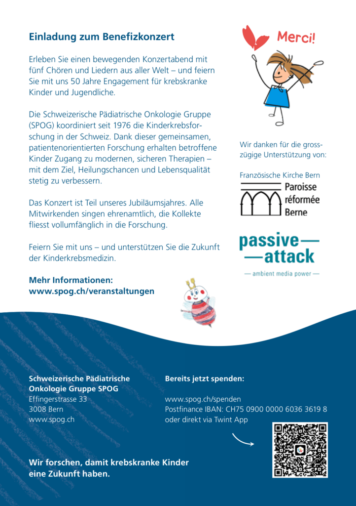 2026年4月25日,17:00-18:30,在伯恩市的法國教堂 (Zeughausgasse 8, Bern) 舉辦慈善演唱會,為瑞士兒童癌症研究中心(SPOG) 募款。
